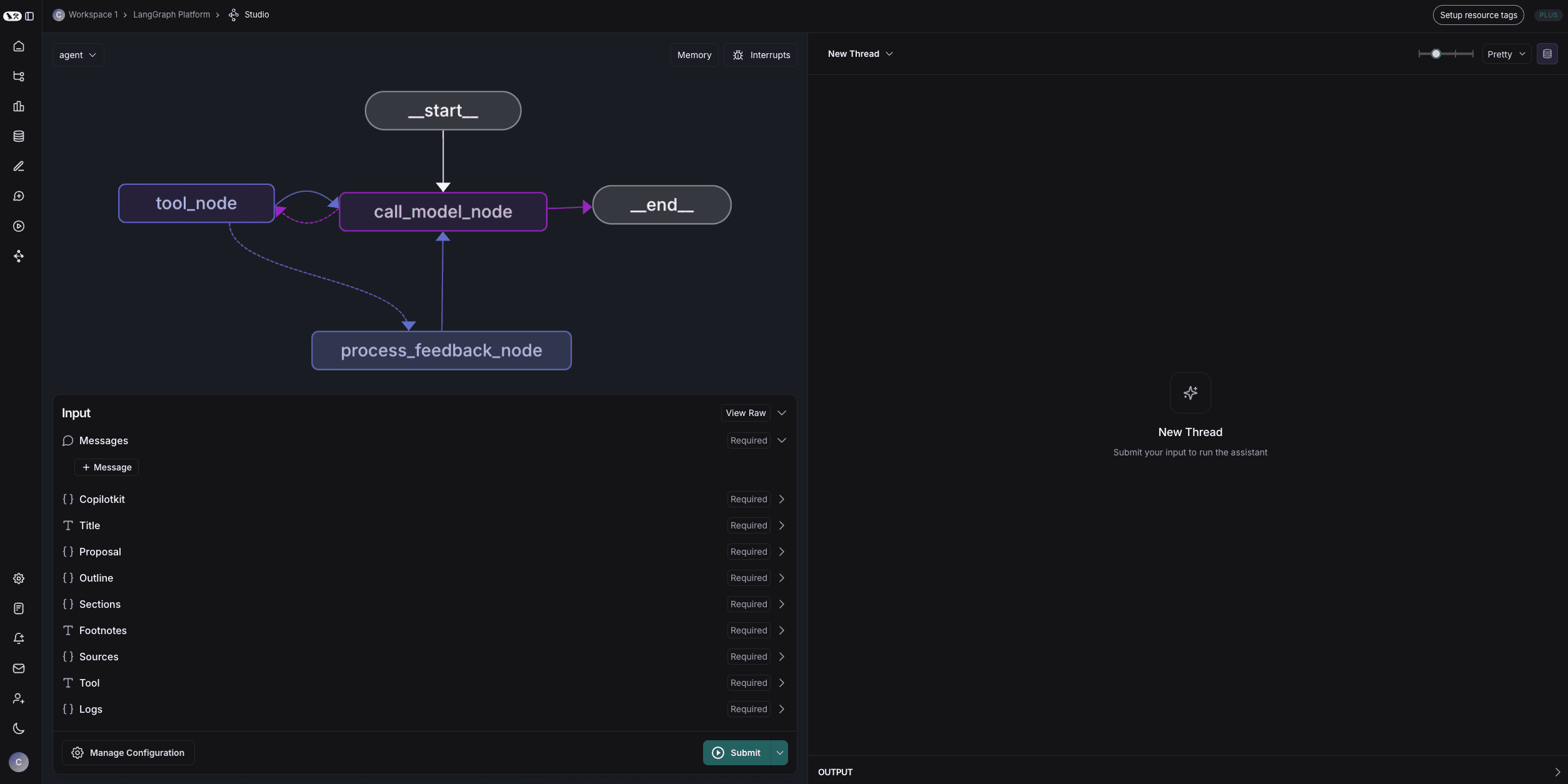 • Interrupts: Interrupts are a way to allow for a user to work along side the agent and review its decisions. In this case, we have an interrupt after the human node which blocks the agent from proceeding until the user provides feedback.